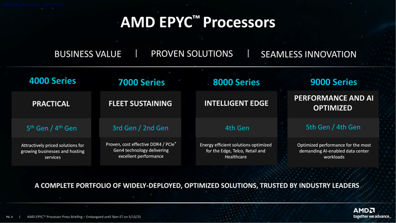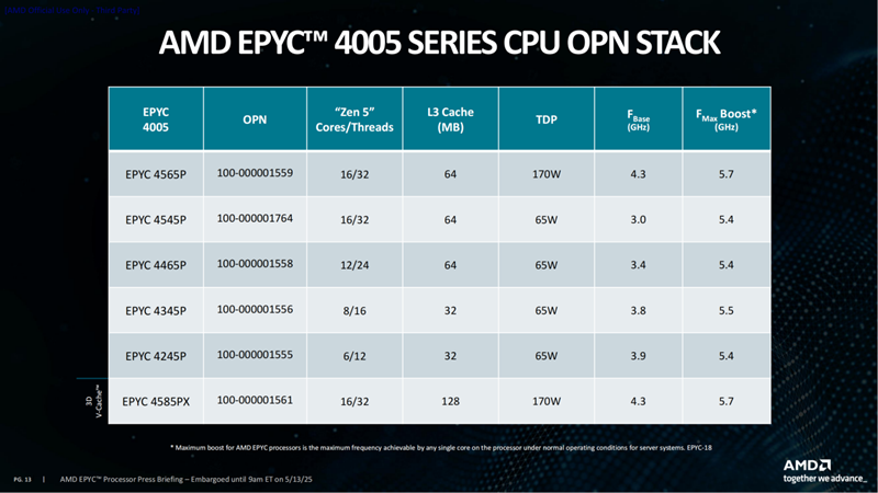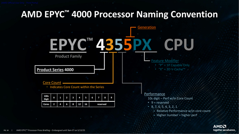 第四位数字则代表代际,EPYC 4005系列就表示是第五代EPYC 4000家族的产品。