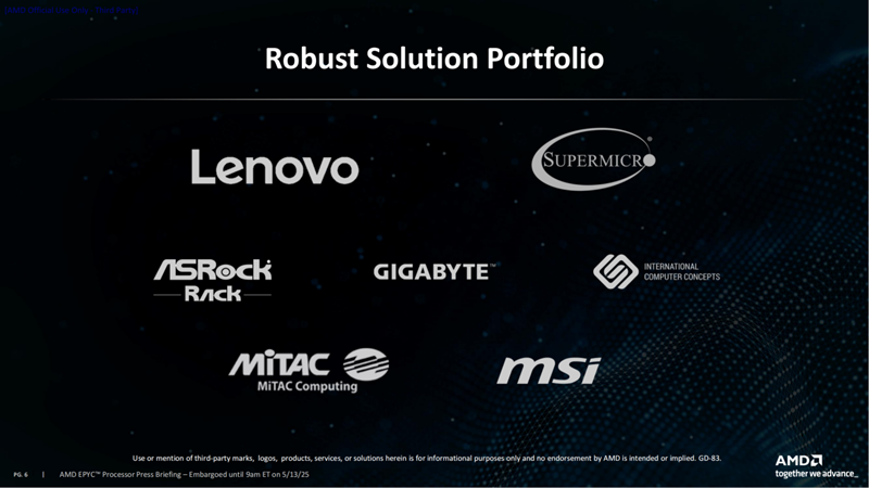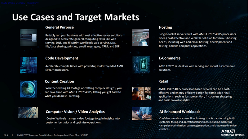 AMD EPYC 4005系列处理器支持一系列被广泛部署的企业级解决方案,并得到了包括Altos、ASRockRack、Gigabyte、Lenovo、MiTAC、MSI、NewEgg、OVHcloud,Supermicro和Vultr在内的领先合作伙伴和客户的支持。
