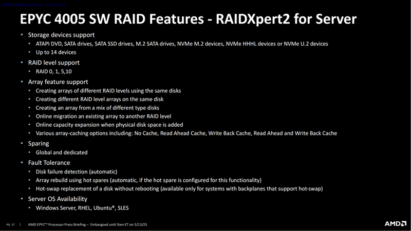 存储方面,EPYC 4005支持各种不同规格的存储设备,且最多支持14台存储设备。同时,EPYC 4005系列也支持RAID管理工具RAIDXpert2,支持RAID 0,1,5,10四种等级,为用户带来丰富的选择空间。
