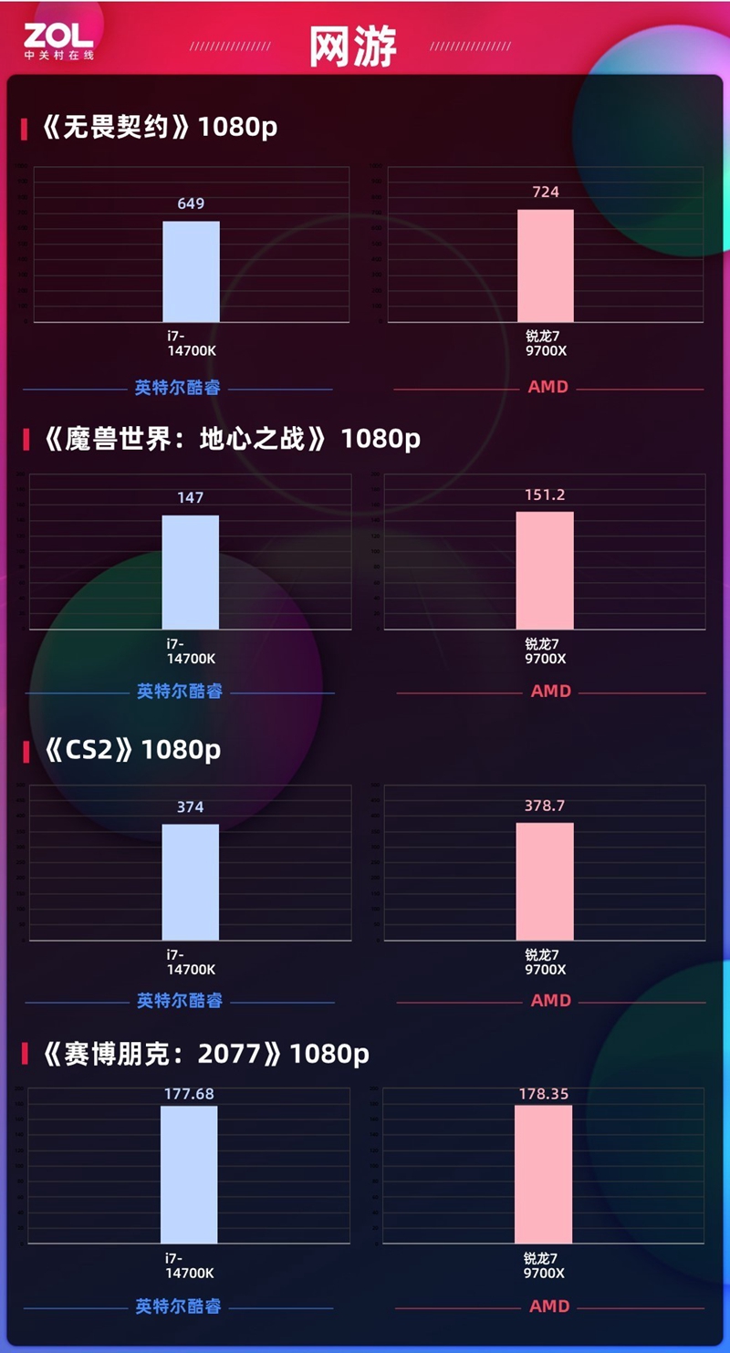 游戏方面,经过实测我们发现锐龙7 9700X在测试的这几款游戏中帧数表现都要更好。而且别的不说,《无畏契约》这种游戏能领先几十帧甚至更高说明目前AMD平台这些年开始起势了。竟除了硬件本身,游戏自身的优化也是重中之重,AMD在市场越来越受欢迎后,游戏厂商更有可能针对AMD平台本身做出优化,让其能在自家游戏上发挥出120%的性能表现。