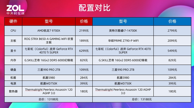 不过参数看不出游戏实际表现,但价格方面还是很清晰明了,锐龙7 9700X比酷睿i7-14700K低了600元,差距蛮大,同预算打造主机足够锐龙7 9700X平台配置提升一个级别。