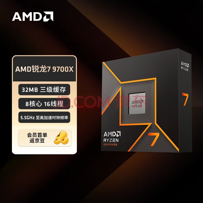 AMD 锐龙 7 9700X处理器(R7) 4nm 8核16线程 加速频率至高5.5GHz盒装CPU 畅玩黑神话悟空/阿凡达/魔兽