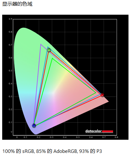 首先是色域测试,根据SpyderXElite软件的测试结果显示,AGON CS24A显示器sRGB色域的覆盖度为100%,AdobeRGB色域的覆盖度为85%,P3色域的覆盖度为93%,这个表现远超官方宣传水平。