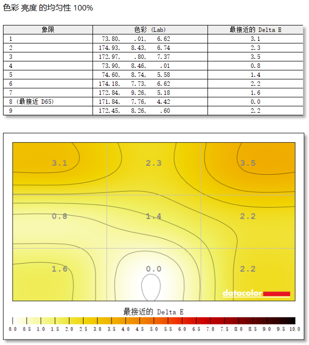 在色彩均匀性的测试中,AGON CS24A显示器的第8象限最接近D65的标准,显示器右边第3象限与标准色温差值最大,不过也只有3.5,整体色彩均匀度表现非常优秀。