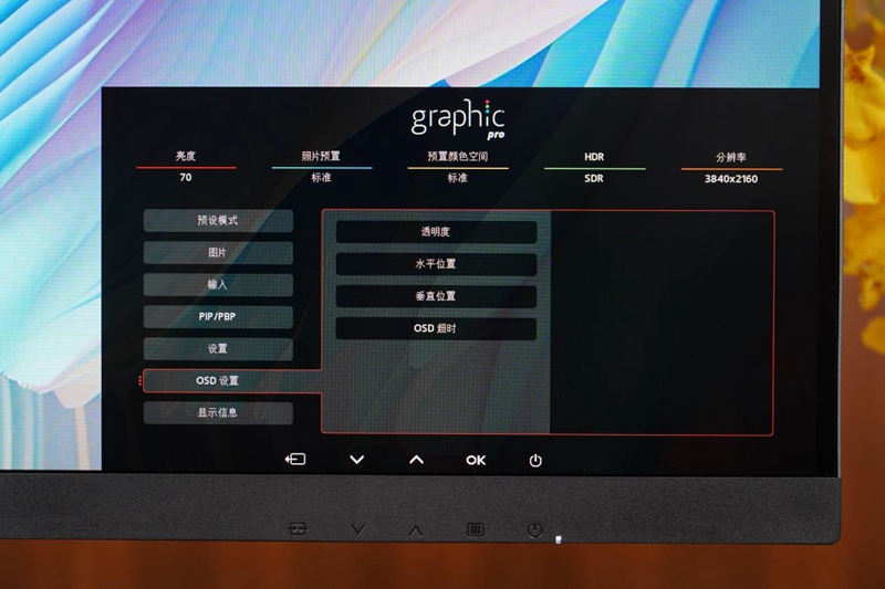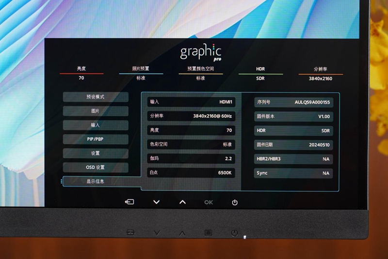 最新的graphic pro菜单专为重视高画质的用户设计,上方会常驻显示显示器当前的亮度、照片预置、预置颜色空间、HDR以及分辨率,用户可以通过菜单自如设置预设模式、显示器亮度、对比度、伽马值等参数,以获得最适合自己的画面显示。