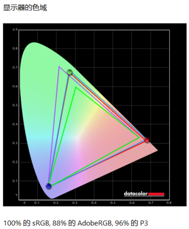 首先是色域测试,根据SpyderXElite软件的测试结果显示,AOC U32U3D显示器sRGB色域的覆盖度为100%,AdobeRGB色域的覆盖度为88%,P3色域的覆盖度为96%,表现完全符合官方宣传水平。