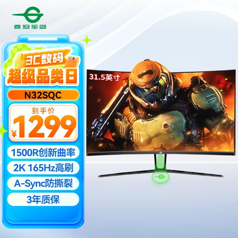 泰坦军团 N32SQ-PLUS 31.5英寸2K高清165Hz 1ms 1500R曲面屏A-Sync防撕裂 可壁挂电竞显示器 炒股票 带信仰投射灯