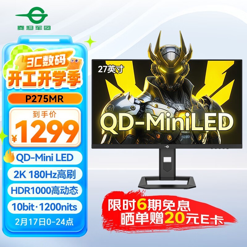 泰坦军团 P275MR是一款27英寸的IPS电竞显示器,采用了Fast IPS快速液晶技术和mini-LED分区背光阵列技术。泰坦军团 P275MR显示器画质出色,色彩丰富,达到了VESA DisplayHDR1000标准,刷新率为180Hz,像素密度约为108PPI,支持多种色域和校色模式。此外,泰坦军团 P275MR显示器还具有多种功能,如Adaptive-Sync、辅助准星等,可以提供更好的游戏体验。目前该款显示器在京东售价为1279元,下单立减100元,晒单再返100元E卡,合计到手价1179元包邮。如果你正在寻找一款高性能的电竞显示器,不妨考虑一下泰坦军团 P275MR。