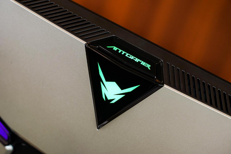 来到背面,一打眼就能看到整体的外观是模仿的蚂蚁头像去设计的,背部最大的氛围灯就像是眼镜一样,值得注意的是,这个氛围灯不仅可以控制明灭,更可以选择不同的灯光呈现方式,十分酷炫。如果未来能够加入AI技术,根据不同游戏以及游玩时角色的当前状态自动变更灯光的效果就更酷了。