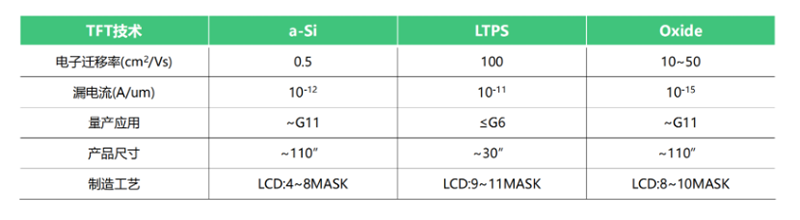 下图为不同TFT技术间电子迁移率的对比,可以看到氧化物技术在这方面要远优于非晶硅技术,差距最高能有100倍。那有朋友会问了,低温多晶硅的电子迁移率更高,为什么不选择它了?