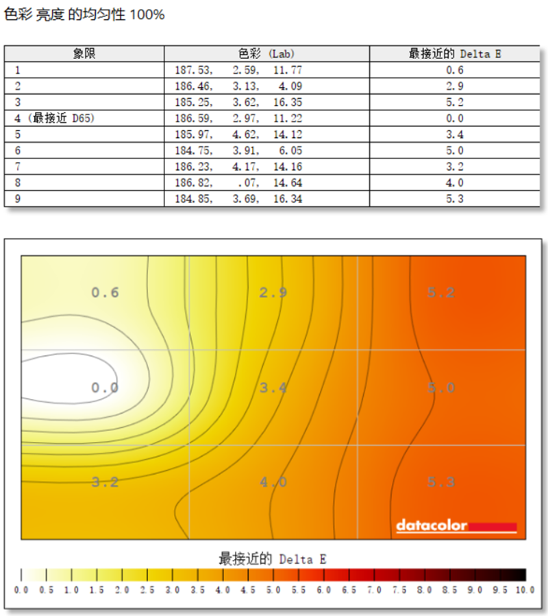 在色彩均匀性的测试中,蚂蚁电竞ANT253PQ显示器的第4象限最接近D65的标准,显示器右边第9象限与标准色温差值最大,不过也只有5.3,整体色彩均匀度表现尚可。