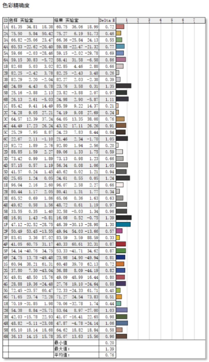 在色彩准确度的测试中,蚂蚁电竞ANT253PQ显示器结果为平均ΔE值为0.76,最大ΔE为1.39。一般来说平均ΔE<2,人眼就基本上分辨不出色彩的差异,蚂蚁电竞ANT253PQ甚至做到了平均ΔE值≤1,最大值也不超过2,可以说即使面对部分专业显示器也毫不逊色。