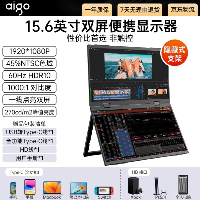 爱国者便携显示器 双屏可折叠外接扩展显示屏 游戏办公炒股显示器手机电脑笔记本 PS4/5副屏Type-C一线通 15.6英寸上下双屏款/高清1080P/低蓝光