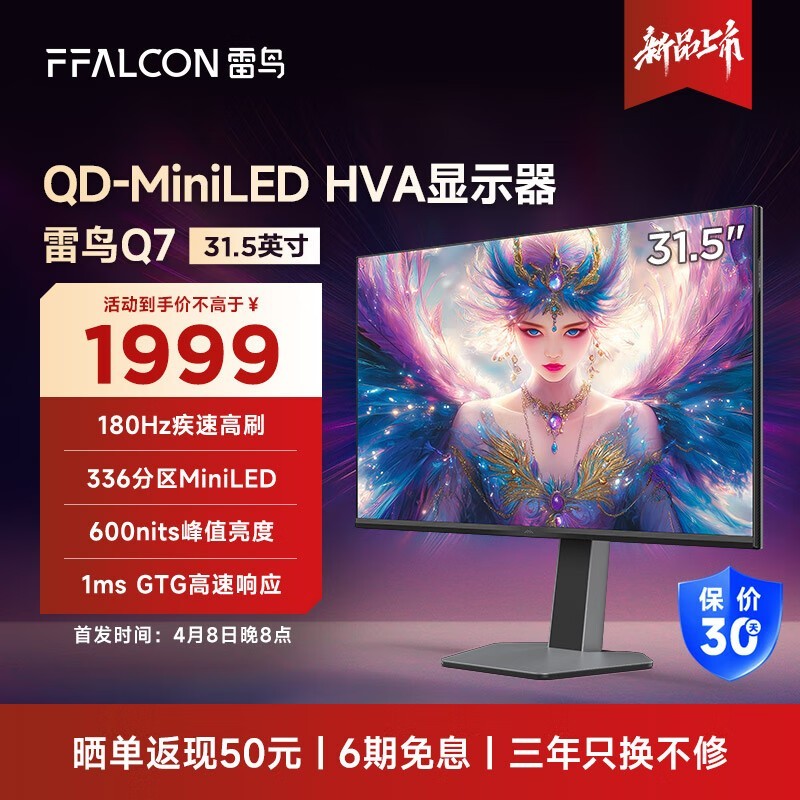 雷鸟 Q7是一款专为游戏爱好者打造的高端电脑显示屏,拥有31.5英寸的大屏幕,2K分辨率搭配180Hz刷新率和1ms超快响应时间,为您带来极致流畅的游戏体验。雷鸟 Q7采用先进的QD-MiniLED技术,支持HDR600高动态范围和广色域显示,画面细节栩栩如生,色彩表现更加逼真。雷鸟 Q7内置高品质音响系统,无需外接音箱即可享受立体声效,让您的游戏或观影体验更沉浸。目前这款显示器在京东的预约价为1999元,参与国补立减15%优惠活动后,下单还可返现50元,最终到手价仅需1649.15元,是性价比极高的游戏显示设备,不容错过!