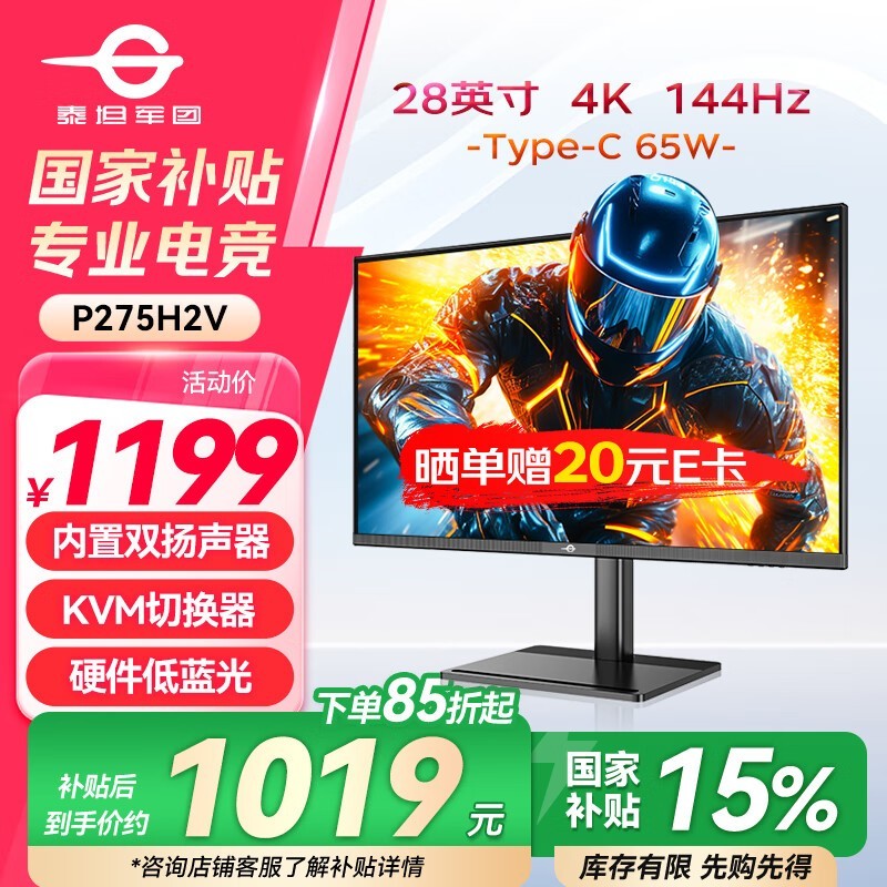 目前,泰坦军团 P275H2V在京东自营原价1199元的基础上,可享受国家补贴立减15%的优惠,到手价仅需1019.15元包邮,是近期难得的好价,电竞玩家和对画质有追求的专业用户千万不要错过!