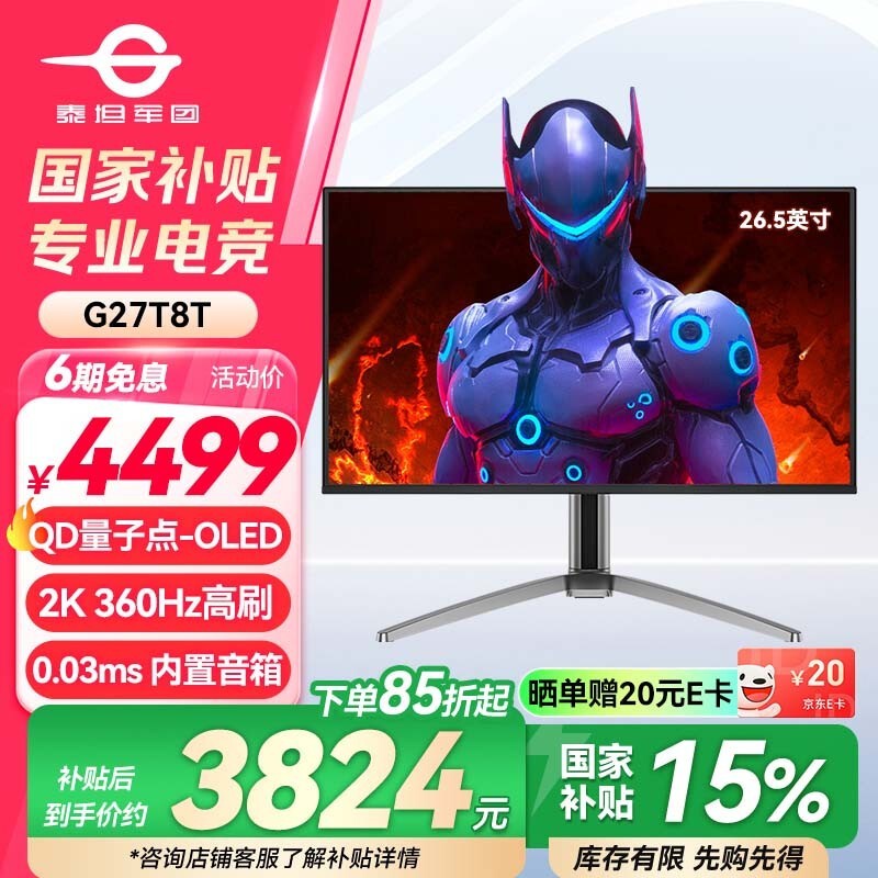 泰坦军团 G27T8T显示器的原价为4999元,现在京东活动售价4999元,参与每满4979元减500元优惠活动,还有国补,下单1件,实付低至3824元,这个价格就能把这款功能强大的显示器带回家。