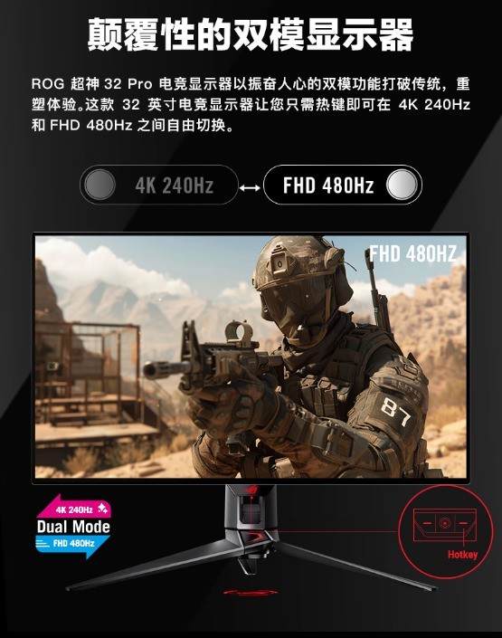 这是一款采用了32英寸双模OLED的电竞显示器,依靠第三代ROG OLED技术,可支持4K 240Hz与1080p 480Hz双模式切换。同时加入了全新的AI助手,可为玩家提升游戏体验。