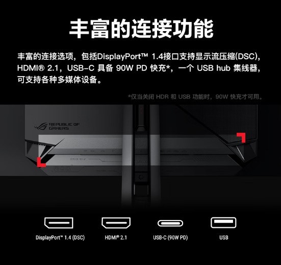 PG32UCDP提供了丰富的连接选项,包括DP接口、HDMI 2.1、USB-C以及以及USBhub集线器,可支持各种多媒体设备。