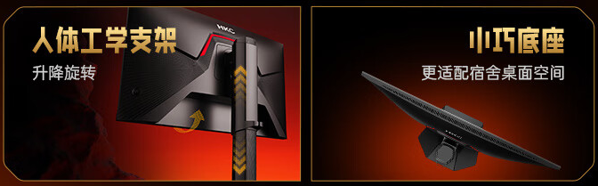 HKC G27H7Pro还配备了人体工学支架,支持升降、俯仰、旋转调节,同时也支持VESA壁挂,更加方便。底座也是占地面积比较小的六边形底座,不会影响到键盘和鼠标的摆放,电竞姿势更舒服。同时HKC G27H7Pro也提供了多种游戏模式,包括游戏准星、暗场高效、游戏计时、FrssSync,并提供多种游戏情景预设,提高玩家胜率。
