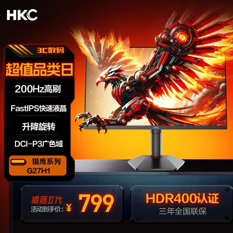 HKC G27H1 27英寸200Hz高刷HDR400高亮度FastIPS显示屏P3广色域电竞PS5游戏旋转升降显示器 猎鹰二代