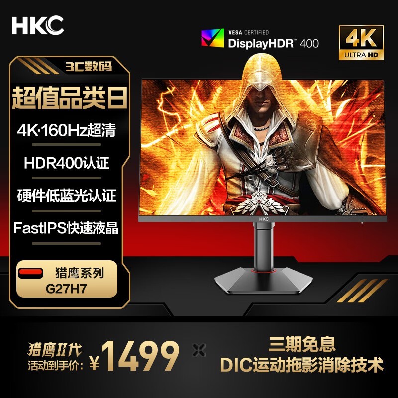 惠科 G27H7 27英寸FastIPS屏4K超清160Hz HDR400硬件低蓝光10Bit 1ms升降旋转电竞游戏显示器 猎鹰二代