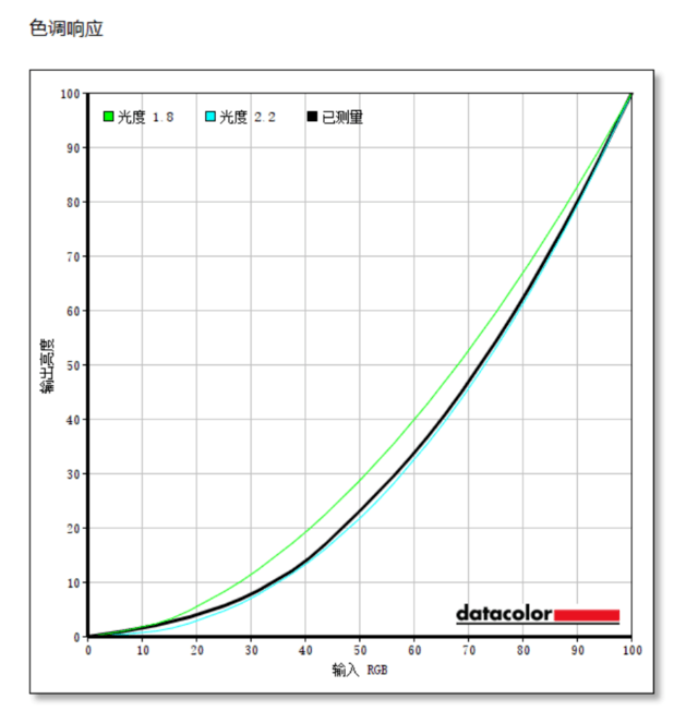 色调响应方面,已测量的黑色曲线应该尽量和浅蓝色的“光度2.2”曲线保持一致,可以看到实测的黑色曲线和“光度2.2”仅有轻微的偏差,色调响应表现比较出色。