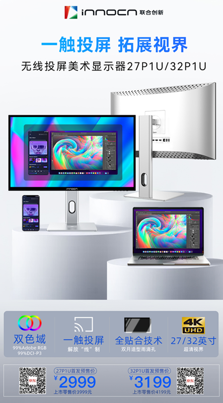 联合创新 P1U系列宽频投屏国画显示器已于6月6日正式上市,联合创新 27P1U市场定价3999元,6月6日京东首发预售,活动时长6月6日10点-6月15日19点30,房款时长15日20:00-17日24点,房款100抵1100,首发价2999,晒单返50元京东E卡!