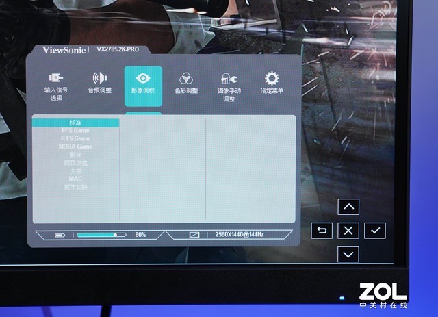 在影像调整选项中,优派 VX2781-2K-PRO不仅有标准、电影、网页浏览、文字等常见的显示模式,还为不同类型的玩家提供了三种专业的游戏模式:FPS、RTS和MOBA。