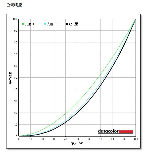 在色调响应方面,测量的黑色曲线应尽可能与浅蓝色的光度2.2曲线一致。可以看出,测得的黑色曲线与光度2.2略有偏差,色调响应性能良好。