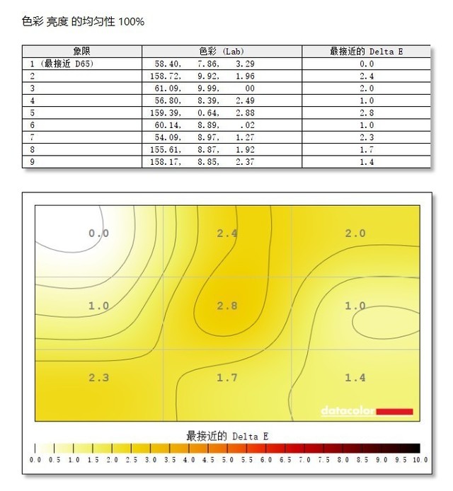 在色彩均匀性的测试中,我们可以看到优派 VX2781-2K-PRO的第一象限最接近D65标准。显示面板的第五象限与标准色温有一定差距,差距仅为2.8,显示整体色彩均匀性较好。在同价位的产品中,这样的表现相当令人惊讶。