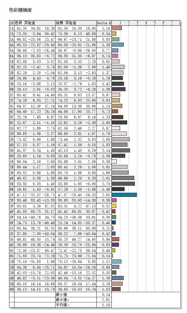 在色彩精度方面,优派 VX2781-2K-PRO测试的48种颜色的平均△E值为1.18,当0△E2时,人眼基本分辨不出颜色的差异。可以看出,这款显示器的色彩还原能力相当不错,基本可以满足专业设计对图片色彩准确度的要求。