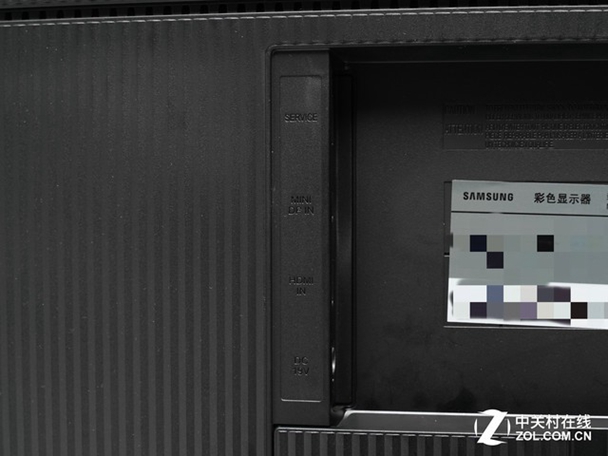 背面采用竖向格栅式的设计,看起来设计感十足,任何角度看上去都是那么美。全机身唯一一颗按键是显示器的五维OSD摇杆,这颗摇杆放在显示器背面左下角,而显示器的接口全部位于显示器背面的正中位置,依次排列着一个USB接口、一个mini DP接口和一个HDMI接口,不过比较遗憾的是上面的USB接口是厂家调试使用的,并不能外接其他设备。