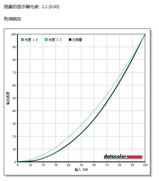 色调响应方面,已测量的黑色曲线应该尽量和浅蓝色的光度2.2曲线保持一致,可以看到实测的黑色曲线和光度2.2曲线非常接近,几乎重合。表现也是非常好。