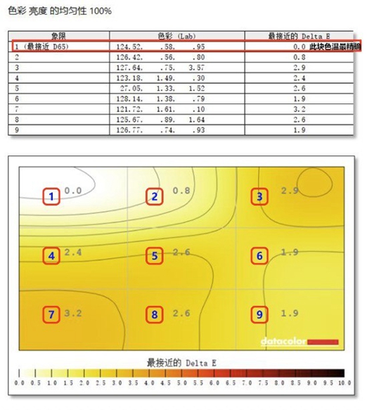 在色彩均匀性的测试中,可以看出显示器左上角的1号区域最接近D65的标准,显示器中间7号区域的色温与标准色温值有一定差距,差距数值为3.2,显示器整体的色彩还是比较均匀的。