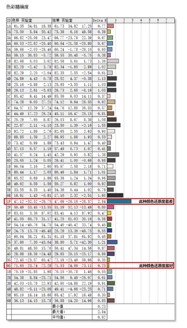色彩精确度方面,显示器测试的48种颜色的平均△E值为0.82,最小值为0.23,最大值为2.84,当△E<1时,人眼几乎不能辨别两个颜色的差异,作为电竞显示器来说这个色准表现已经非常的优秀了,IPS面板的优势发挥的淋漓尽致。