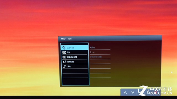 显示器的OSD菜单有EyeCare、图片、图像高级设置、音效设定、系统五项。在EyeCare中除了传统的低蓝光我们还可以看到B.I.+的选项,其实据了解,这是明基独家的一个爱眼调色技术,也是这台显示器的主要卖点之一,我们在后面还会进一步详细解释。