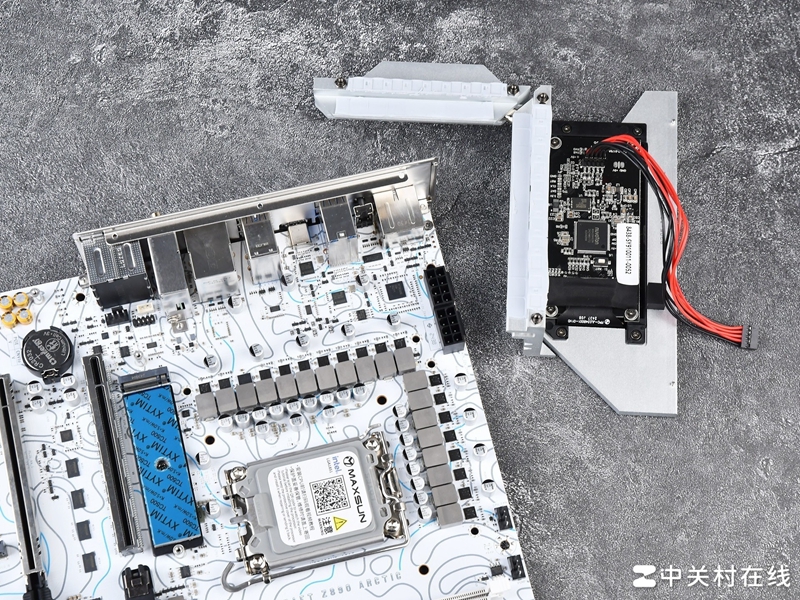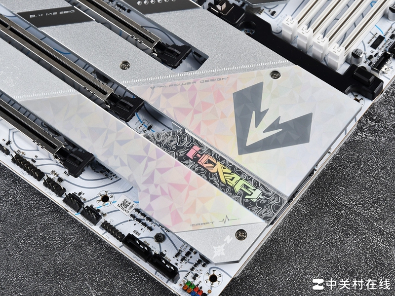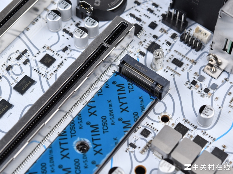 M.2方面,铭瑄MS-iCraft Z890Arctic主板板载4组NVMe M.2插槽,顶部采用双向导热垫设计的插槽支持PCle 5.0,直连CPU。其余三个插槽为PCle 4.0,并支持22110全长尺寸。
