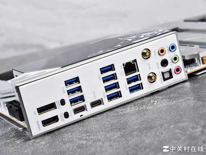 除了丰富的USB接口,铭瑄还在I/O区域配置一个DP接口,一个HDMI接口,一个5G有线网口,一个Wi-Fi 7天线接口,Wi-Fi 7无线网卡会集成蓝牙5.4,此外还提供5个音频输入输出接口,S/PDIF光纤口,以及两个用于重置BIOS和更新BIOS的快捷按钮。