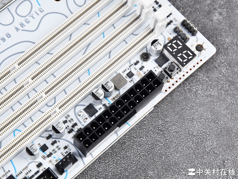 顶部区域铭瑄瑄 Z890 Arctic主板支持DIY快捷开启和重启,同时配备检测故障很好用的Debug数字检测屏。