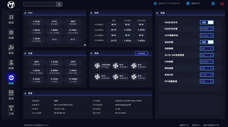 超频界面下方是状态菜单,此处查看整机硬件详细运行情况,并且能调整主板上的RGB灯效开关以及进行USB唤醒、休眠这些细节设置。