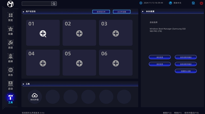 最后的工具菜单支持超频预设,将超频参数保留,方便重置参数后不用再2次调节,节省超频时间。此外这里也可以升级BIOS。
