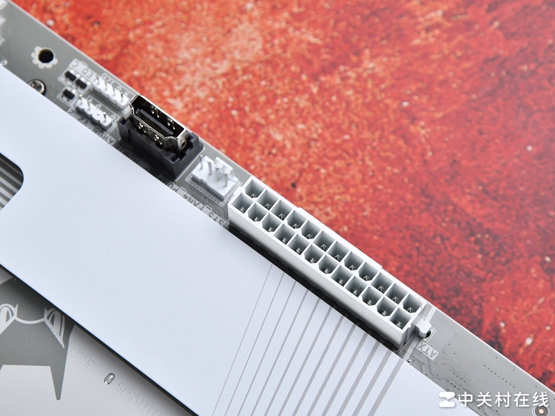 SATA接口也放在了背面,总共有4个,并且周围提供一个USB 3.2 Gen 2x2 Type-C(20Gbps)接针和一个USB 3.2 Gen 1 Type-A(5Gbps)接针。