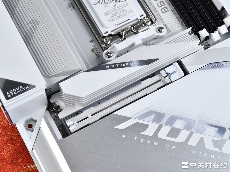 下面来到了PCIe插槽,技嘉 B650E冰雕背插版提供了一根PCIe 5.0显卡插槽,采用了强化超耐久金属合金打造,比起一般的合金装甲更坚固耐用。