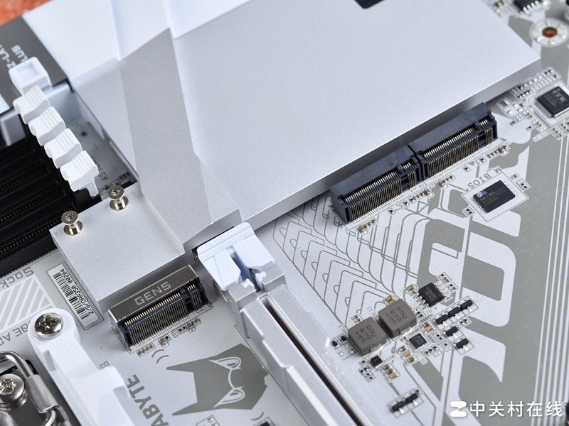拆卸显卡周围正面的装甲,里面包含三组M.2插槽,包括一个PCIe 5.0 M.2插槽,支持全长尺寸,并且做了特殊标识,方便小白找到。剩下两个为PCIe4.0插槽。这三个M.2插槽都支持免螺丝安装。