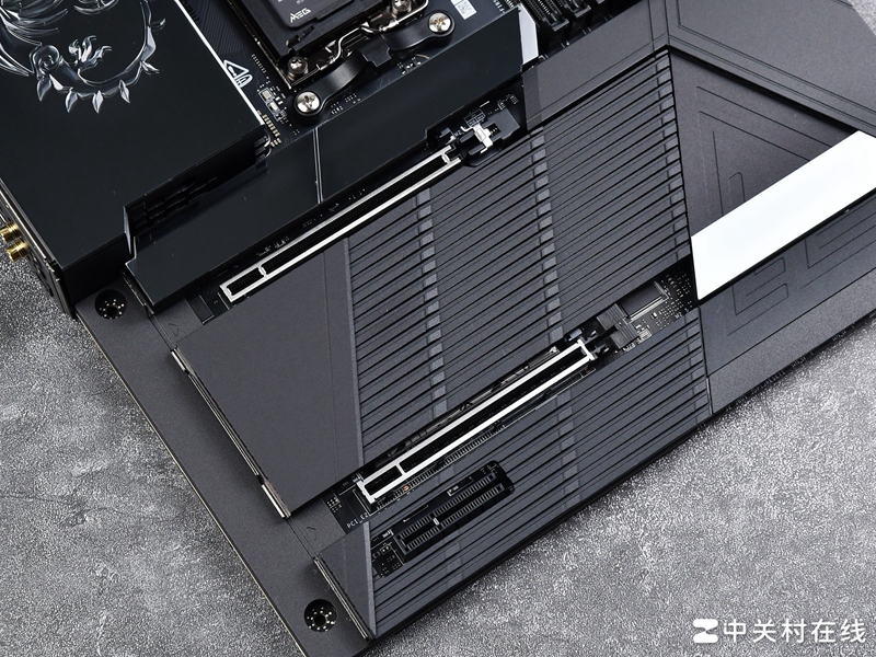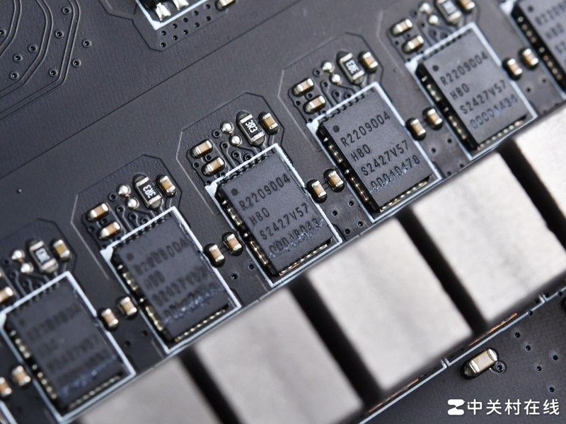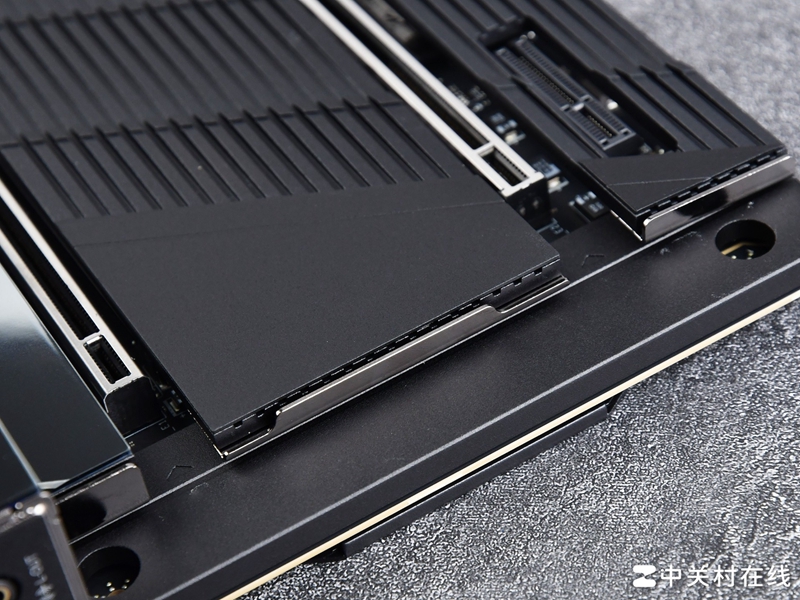 这款主板的VRM散热装甲规模也前所未有的庞大,采用了波浪式鳍片设计,两块鳍片之间连接直触式交叉导热管,并且为MOS管准备了9W/mK散热垫。