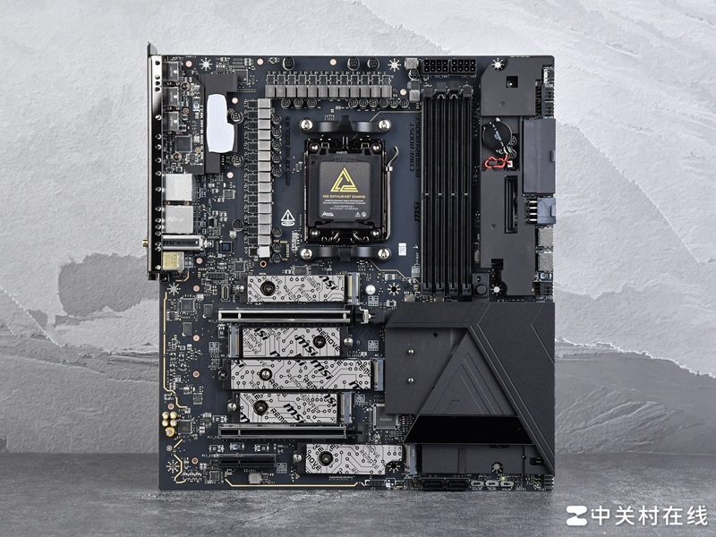 这款主板采用了全覆盖式装甲设计,而且考虑到装机后的效果,微星特意采用了隐藏式侧插接针,正面除了CPU供电接口和内存、PCIe插槽外见不到其他主板接针,设计效果接近了背插主板,正面几乎无线材裸露,这种纯正简约风格符合时下装机潮流,难得能在超神这种旗舰主板中见到这样影响整个装机风格的外观创新设计。