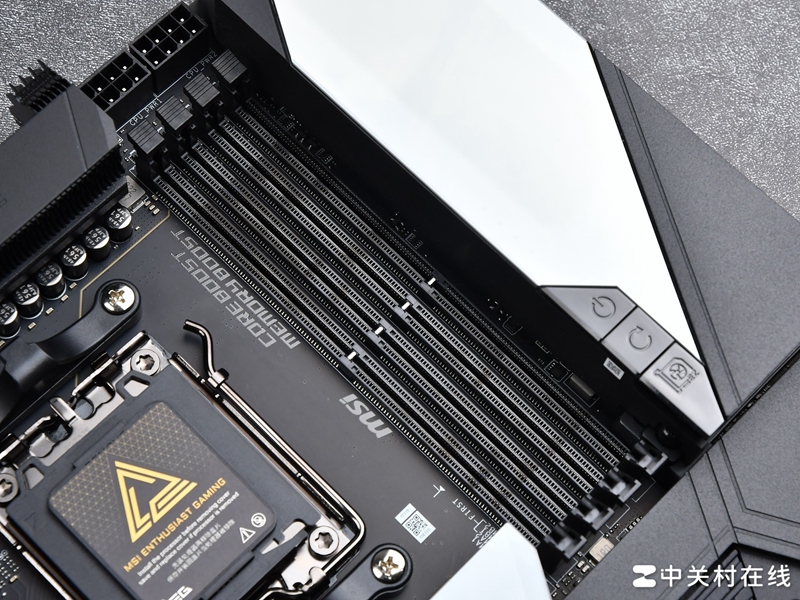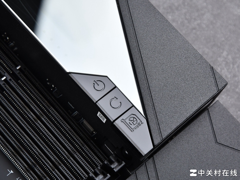 这块区域还集成三个快捷按钮,分别为开启键、重启键以及一个显卡快拆按钮,快拆按钮按住后即可拆卸显卡,目前微星主板都支持这一便捷DIY设计,这款超神主板展现形式明显更高级。