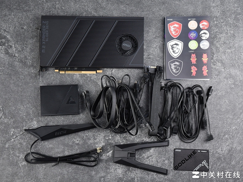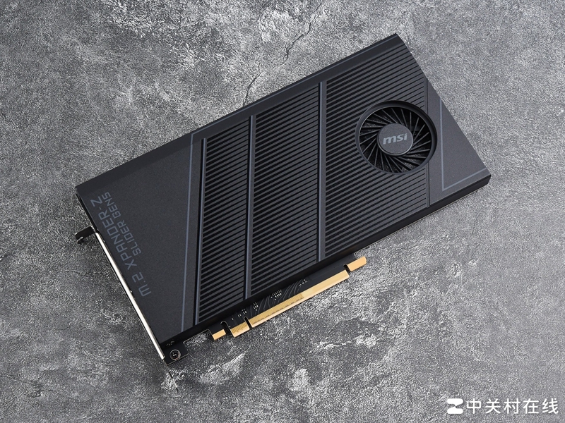 除了这5组主板上的原生M.2插槽,微星还在配件中提供了一个M.2 XPANDER-Z SLIDER GEN5 扩展卡,通过这个拓展卡你可以拓展额外两个PCIe 5.0的M.2接口,比如将插到上面的PCIe 2槽上就可以启动这两个PCIe 5.0 M.2。这个拓展卡本身有独立的散热装甲,自带涡轮散热,造型形似一块显卡。