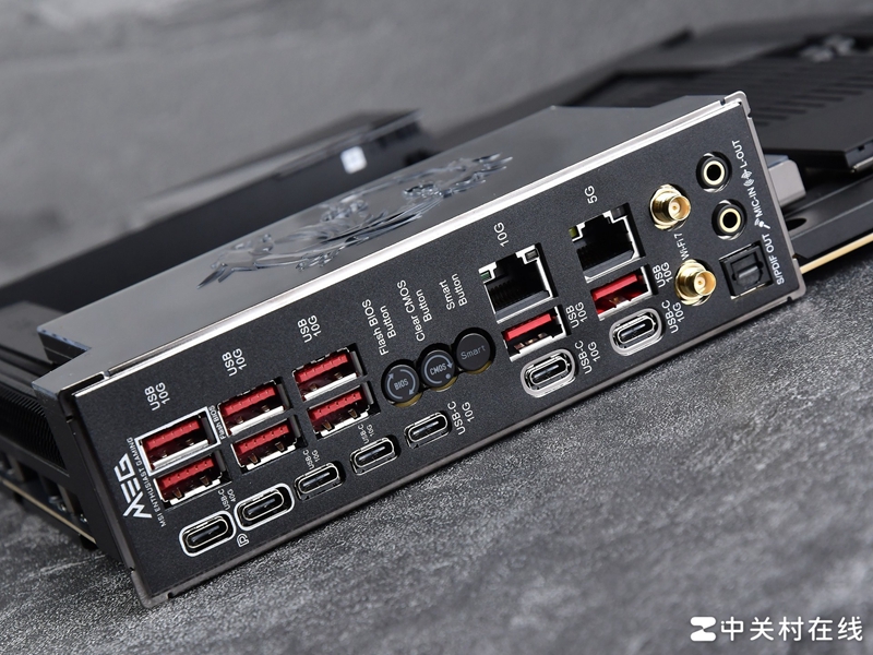 微星 X870E GODLIKE超神主板几乎将I/O区域塞满了,提供了15个USB接口,还没有USB 2.0这种。包含了8个USB 3.2 Gen2 Type A(10Gbps)接口,5个USB 3.2 Gen2 Type C(10Gbps)接口,还有两个USB 40Gbps Type C接口。需要注意USB 40Gbps Type C接口与上面的M.2_2共享PCIe 5.0x4带宽,只要这个M.2_2槽插入了SSD,双方速率都会降至PCIe 5.0 x2,如果想要M.2_2槽保持PCIe 5.0x4满血带宽,就需要在BIOS设置,但USB 40Gbps Type C接口之后将会以PCIe 4.0 x4带宽运行。