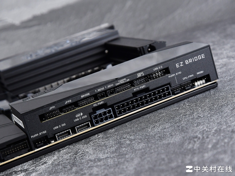 跳线方面,咱们先来看一下EZ Bridge集成器,目前有点类似I/O区域的设计,这个区域包含了主板供电、CPU Fan、Pump Fan、USB 2.0接针、USB 3.2 Gen2 Type C(10Gbps)接针、USB 3.2 Gen2x2 Type C(20Gbps)接针,这个前置USB 20Gbps接口还提供PD快充,但需要接上8pin PCIe供电接口来实现。而能看到EZ Bridge集成器里每个接口标注也都十分清晰。